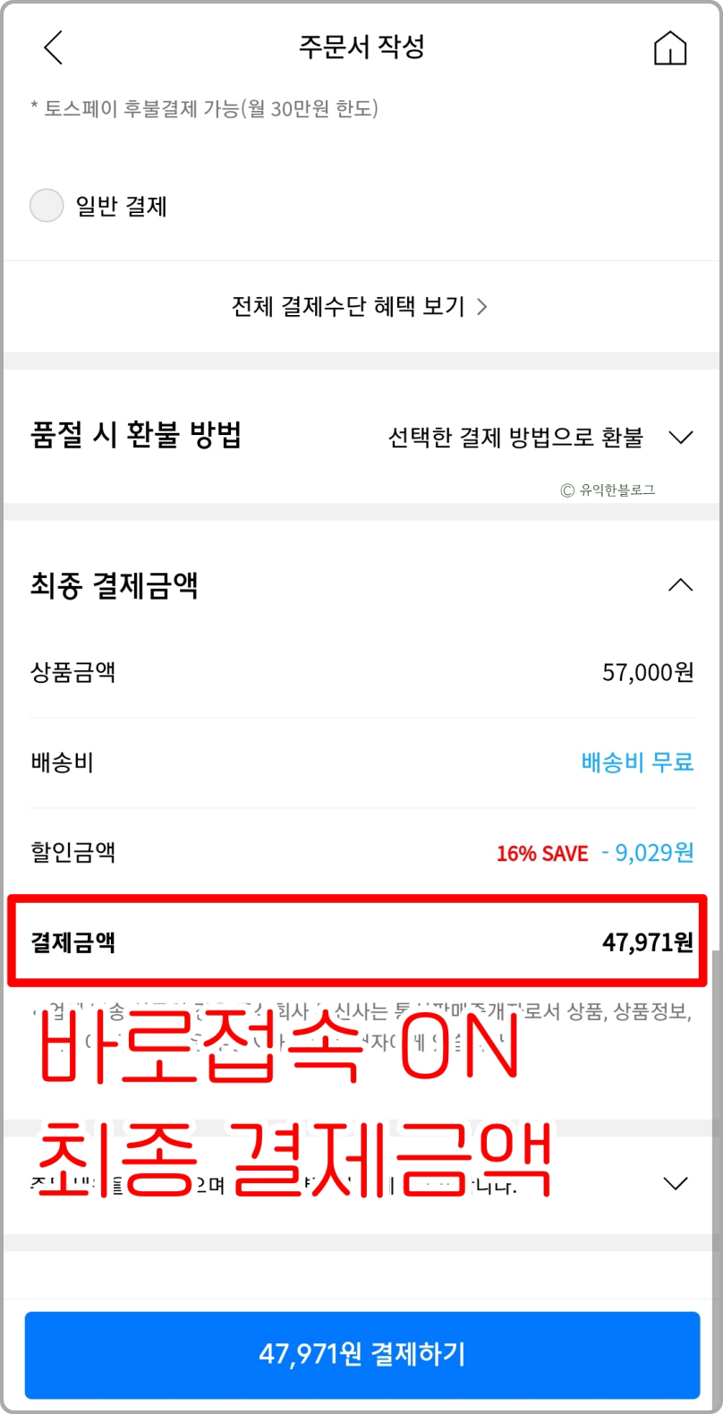 왼쪽이 바로접속 off, 오른쪽이 on 상태입니다. (참고로 적립금 선할인까지 적용함)