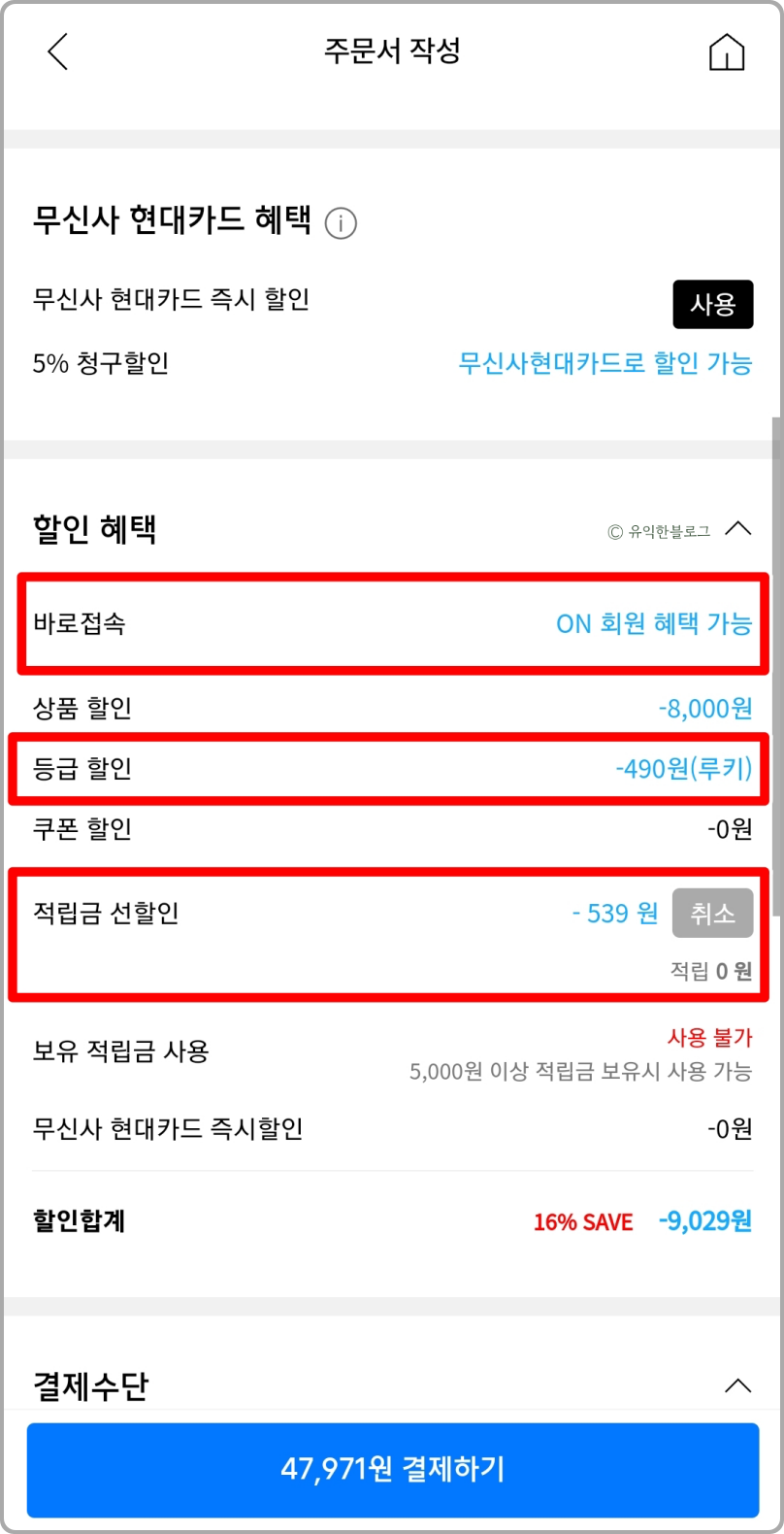결제 화면으로 넘어가보면 ‘ON 회원 혜택 가능’ 이라고 바뀌어 있는 것을 볼 수 있습니다. 등급 할인, 적립금 선할인 모두 적용이 되는 것을 볼 수 있어요.