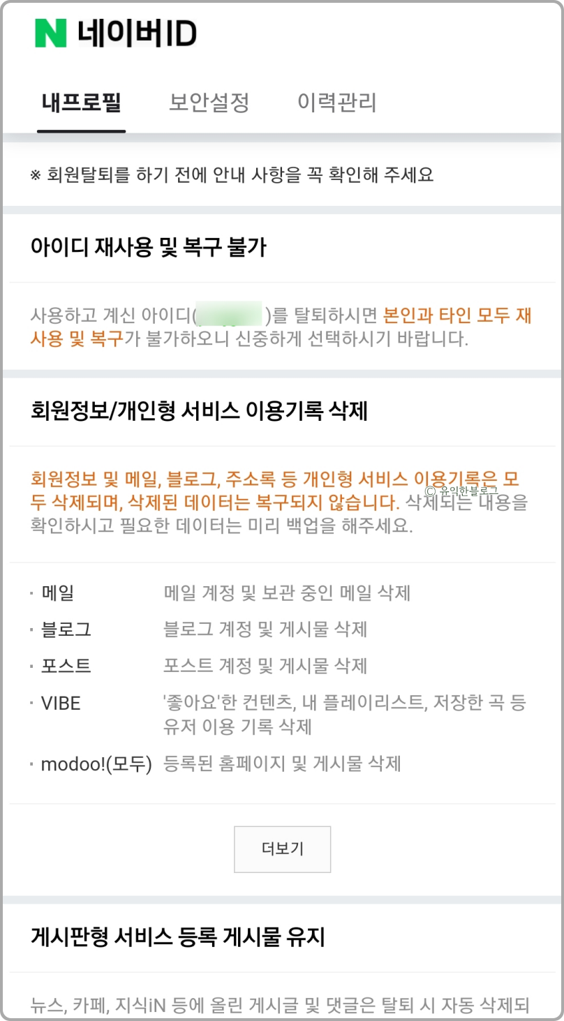 아이디 재사용 및 복구는 불가하며, 메일, 블로그 게시물 등이 전부 삭제된다는 내용이네요.