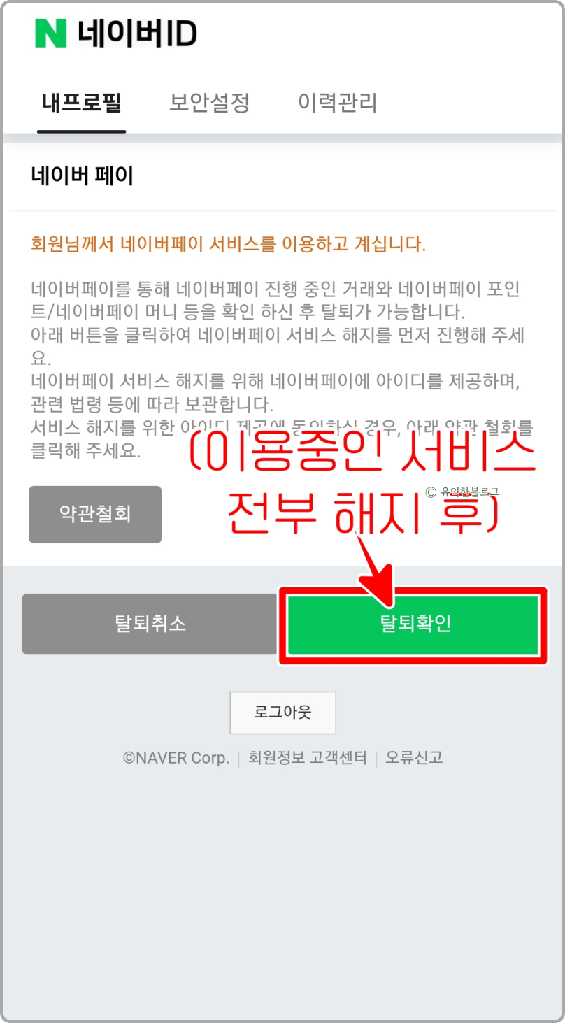 해당 아이디로 이용하던 네이버페이 등 서비스를 해지하라는 화면이 뜹니다.