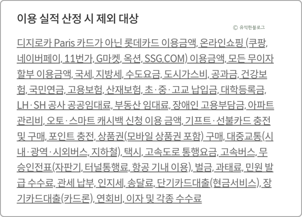 세금, 공과금, 4대보험, 각종 학교 납입금, 상품권 등등은 실적에서 제외되는 것은 기본이고요. 대중교통, 택시, 고속도로 통행요금도 전부 제외되네요.