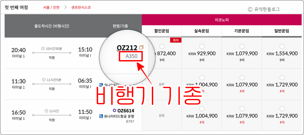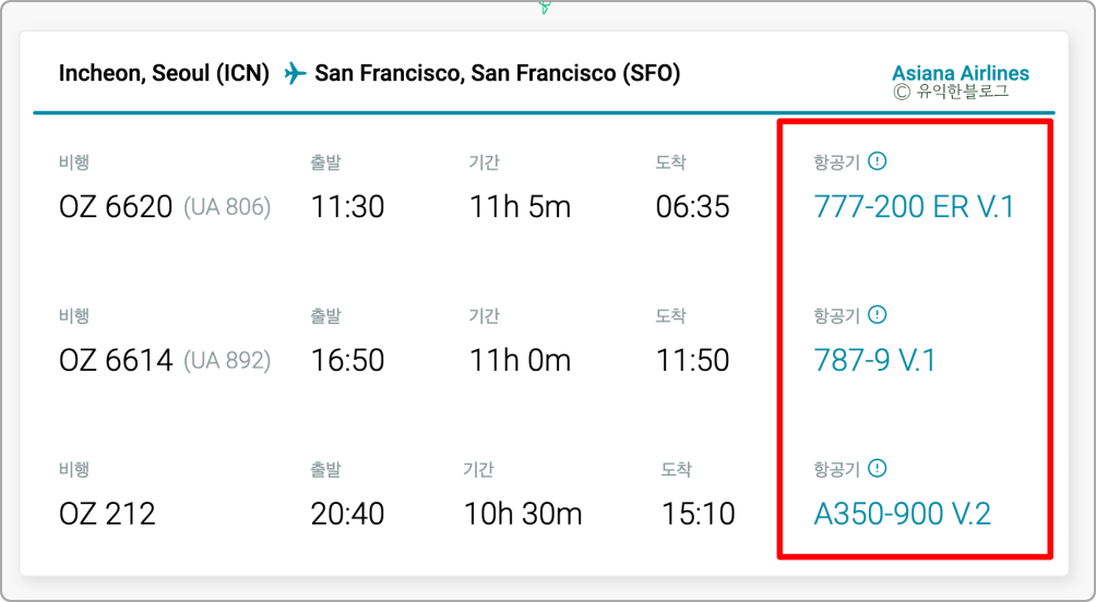 인천에서 샌프란시스코로 가는 비행기를 예매중인 화면인데요. 편명 아래에 조그맣게 비행기 기종이 표시되어 있는 것을 볼 수 있습니다.