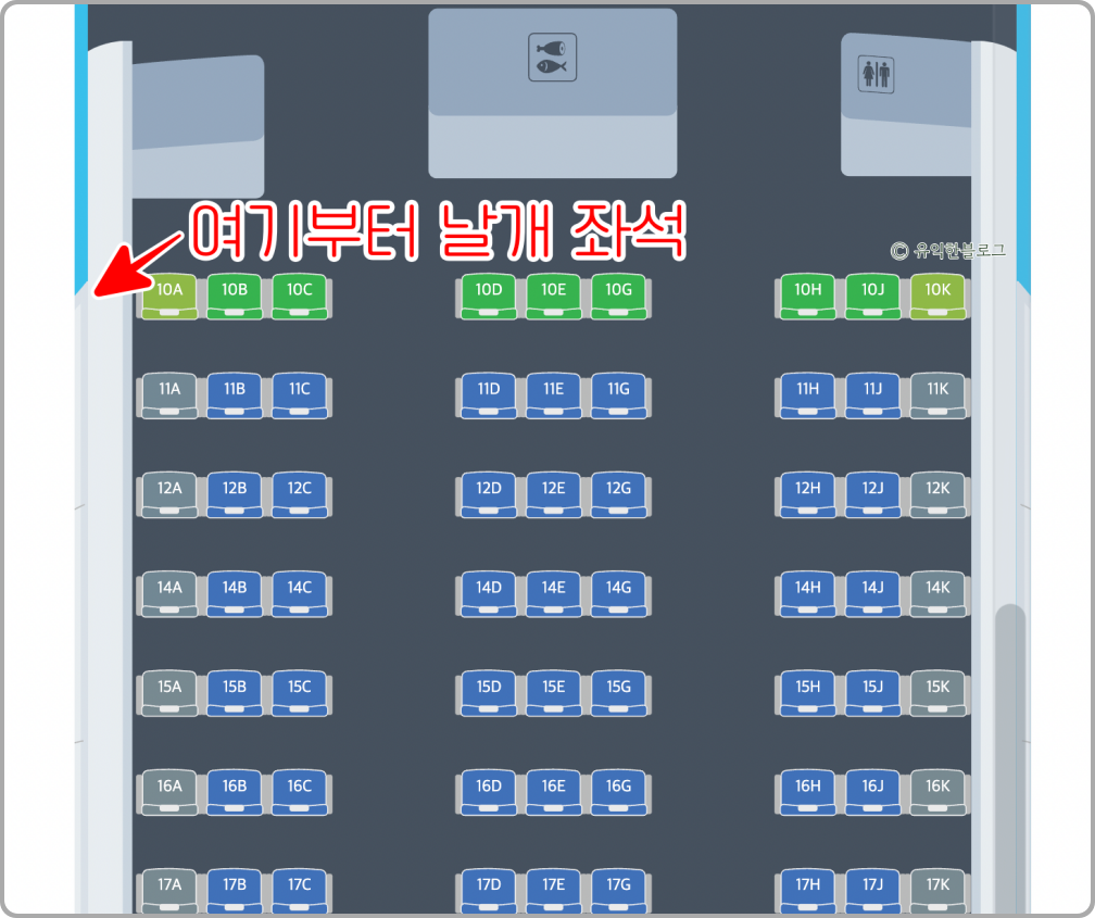 양쪽 끝을 봤을 때 하늘색에서 하얀색으로 바뀌는 부분은 날개가 있는 쪽이라고 하니 좌석 선택 시 참고하시길 바랍니다.
