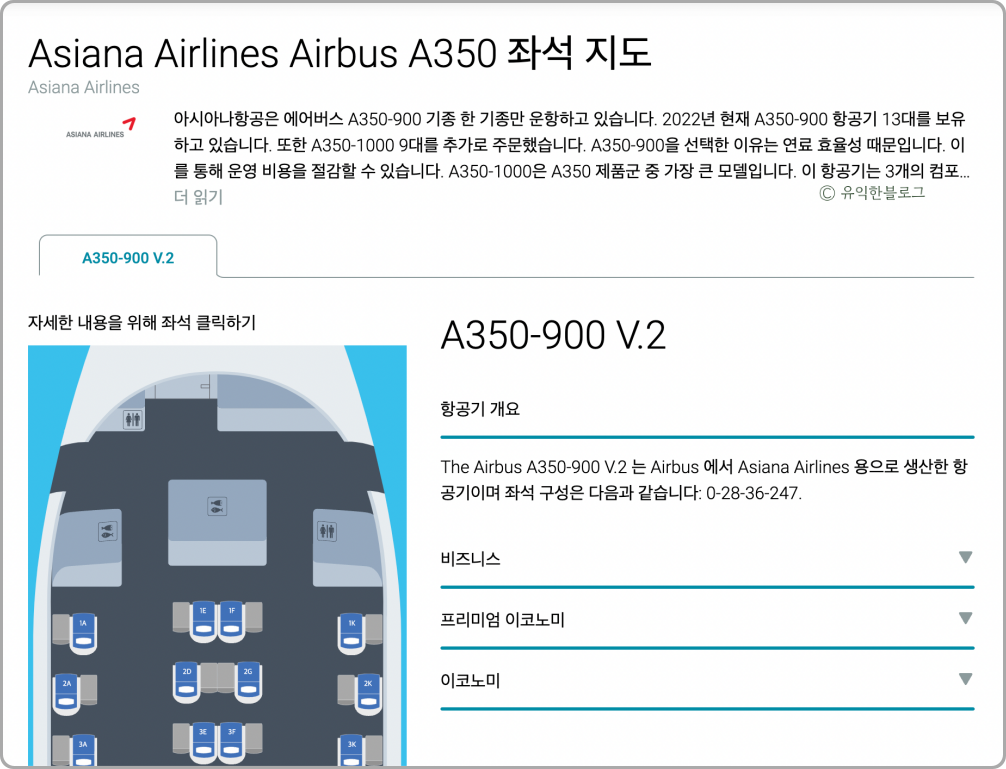 항공기명을 클릭하면 해당 기종에 대한 자세한 설명과 함께 좌석 배치도도 볼 수 있어서 참고해보시면 도움이 되는데요.