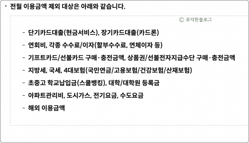 전월 이용금액 제외 대상을 살펴보면 아래와 같습니다.