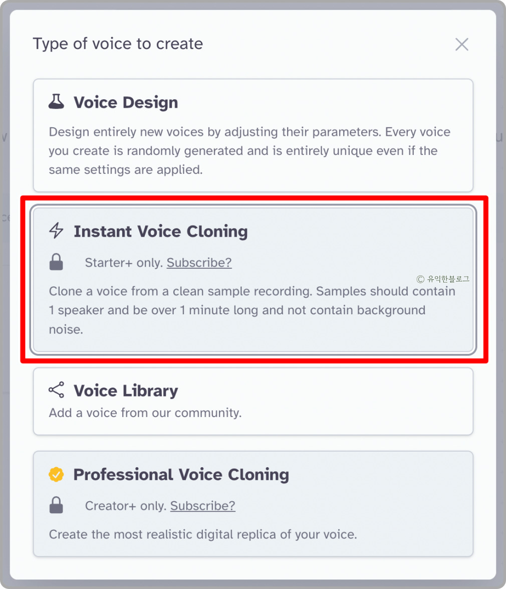 여기서 ‘Instant Voice Cloning’을 선택해 줍니다. 전 아직 유료 요금제에 가입을 하지 않아 사용이 막혀 있네요.