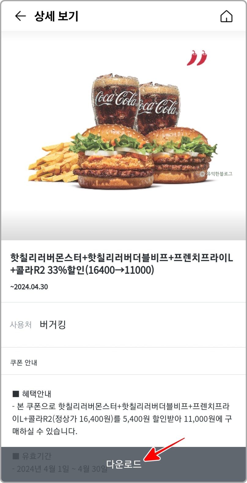 핫칠리러버몬스터+핫칠리러버더블비프+프렌치프라이L+콜라R2까지 해서 11,000원에 먹을 수 있는 쿠폰입니다.