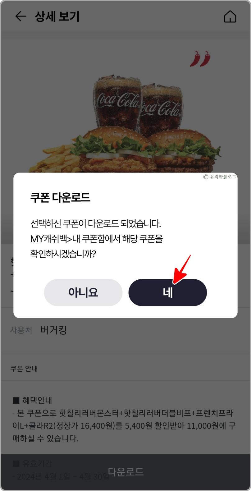 다음 화면에서 [다운로드]를 눌러주면 쿠폰이 다운되고, [MY캐쉬백 > 내 쿠폰함]에서 바로 해당 쿠폰을 확인해보실 수 있어요.