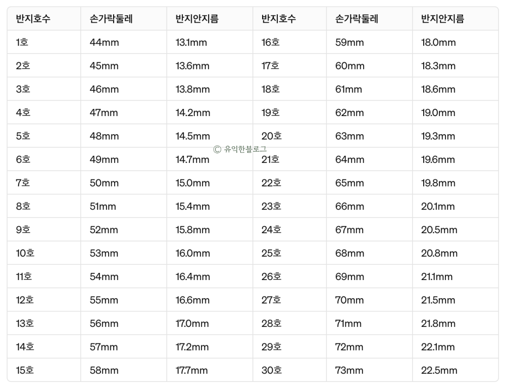 그리고 그 수치를 KS 규격 반지 호수 표와 비교해 보시면 되는데요. KS 규격 반지 호수 표는 아래 이미지를 참조해 주세요.