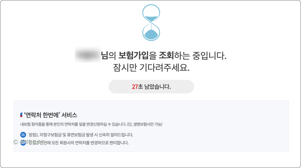 그러면 'OO님의 보험가입을 조회하는 중'이라는 화면이 뜹니다. 그대로 약 30초 정도 잠시 기다려주세요.