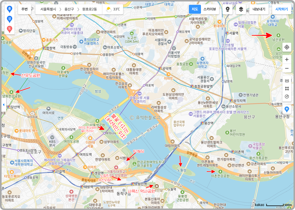 - 이촌 한강공원 👉 63빌딩 바로 맞은편에 위치하고 있어 전통적인 명당으로 꼽힙니다.