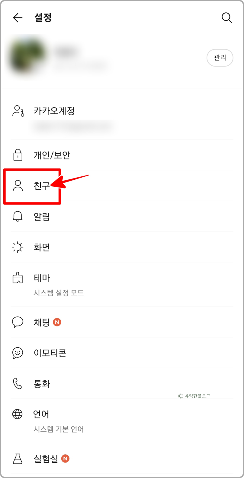 그러면 여러가지 메뉴가 뜨게 되는데, 여기서 ‘친구’ 라고 되어 있는 메뉴를 선택해 줍니다.