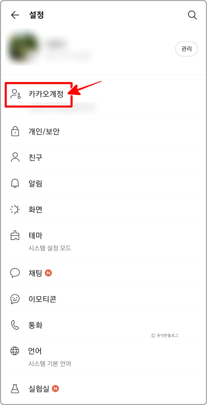 이번에는 내 프로필 아래에 보이는 ‘카카오계정’ 메뉴를 선택해 줍니다. 그리고 내 계정 정보에 있는 ‘내 정보 관리’ 메뉴로 들어가 주세요.