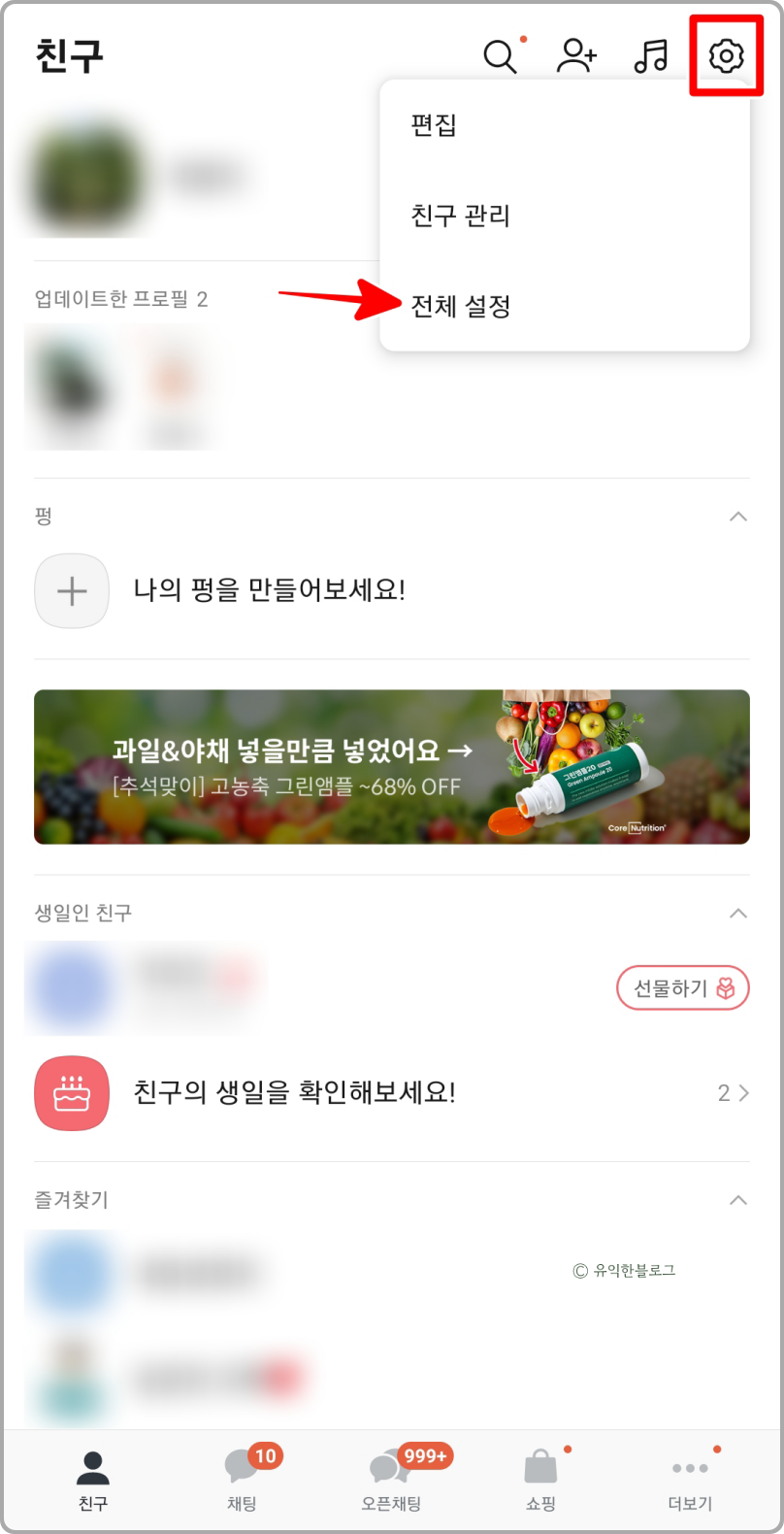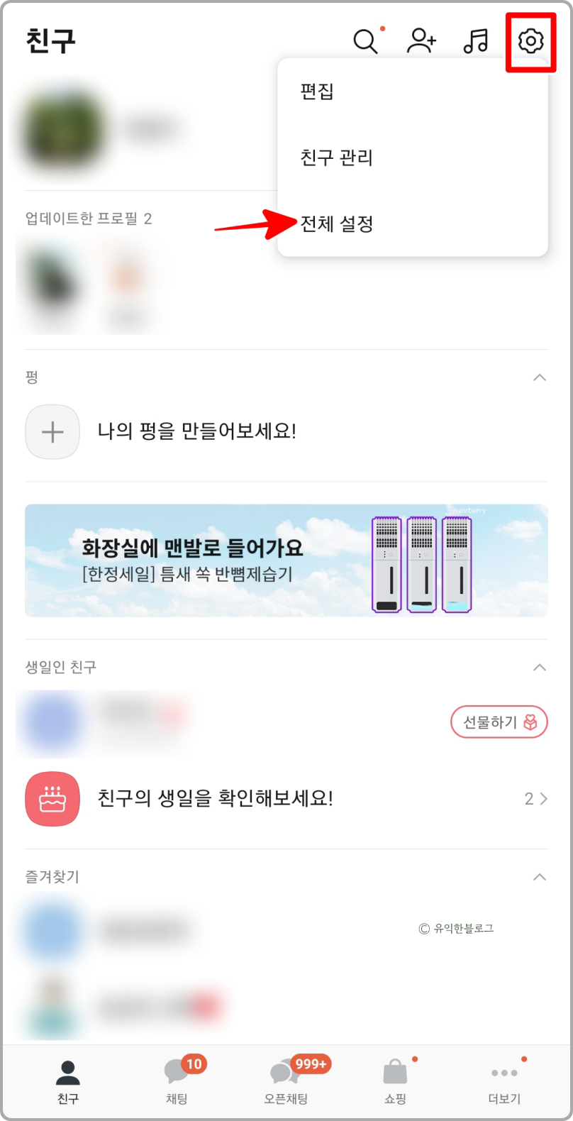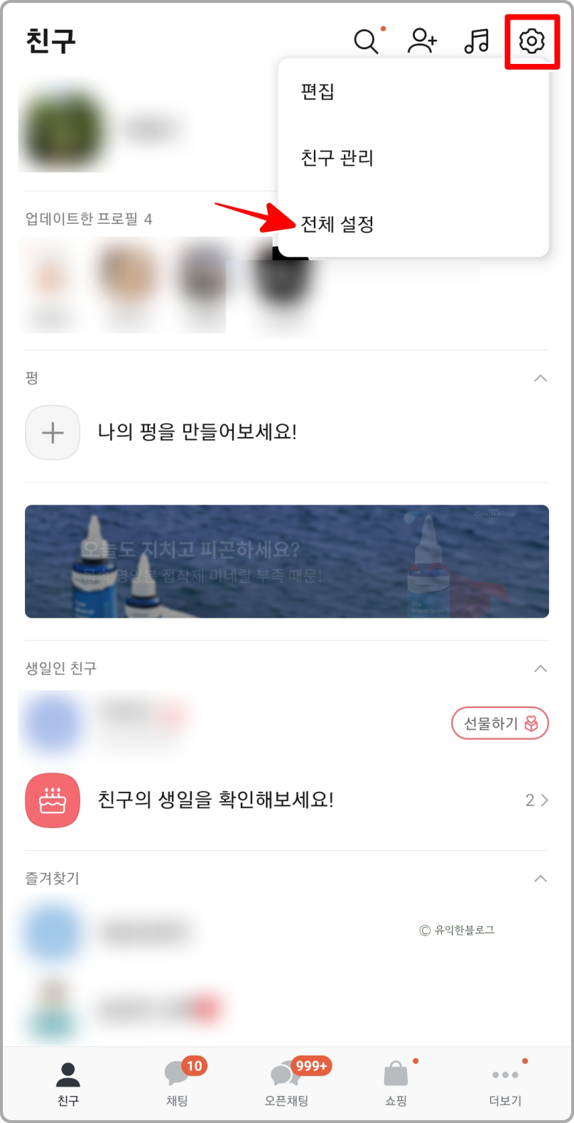 아까와 마찬가지로 친구 목록 화면에서 오른쪽 상단에 있는 톱니바퀴 아이콘을 클릭한 뒤, ‘전체 설정’ 메뉴를 선택해 주세요.