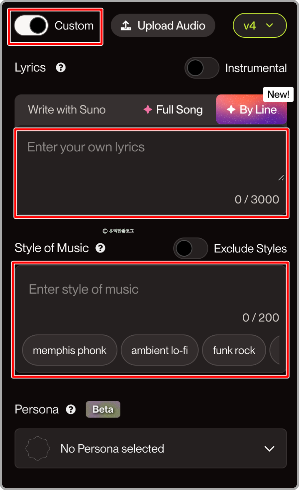 Custom 이라고 되어 있는 부분을 활성화 한 다음, [Lyrics]라고 된 부분에 가사를 입력하고 [Style of Music]라고 된 부분에는 원하는 음악 스타일(분위기, 장르 등)을 구체적으로 입력하시면 됩니다.