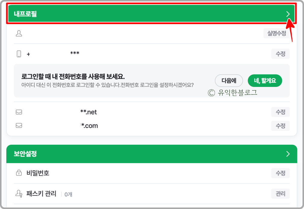 다음 화면에서 '내프로필' 이라고 되어 있는 부분을 클릭합니다. (초록색 부분)
