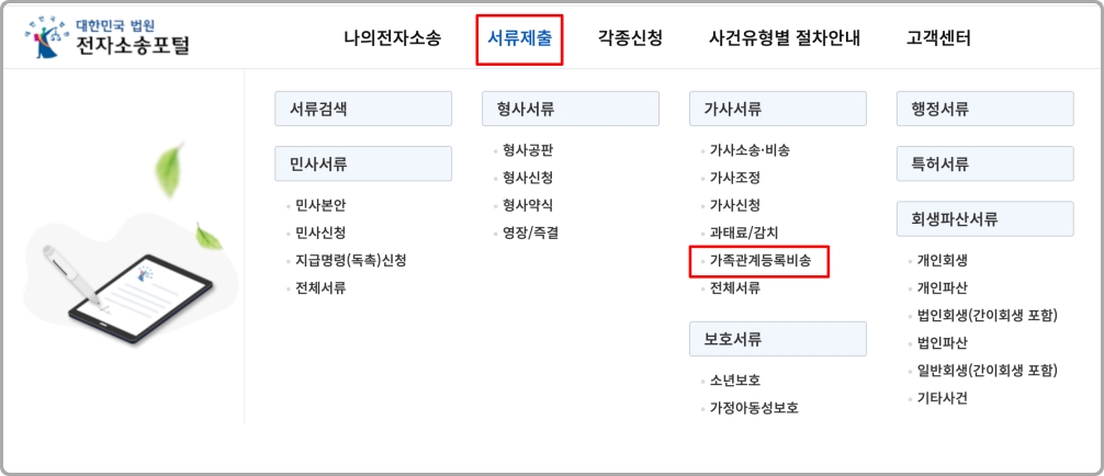 그리고 상단 메뉴에서 [서류제출] > [가사 서류] > [가족관계등록비송] 항목을 찾아 클릭해 줍니다.
