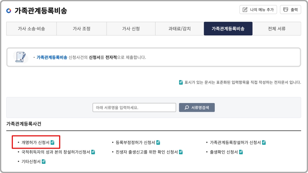 '개명허가신청서'를 찾아 클릭해 주세요.
