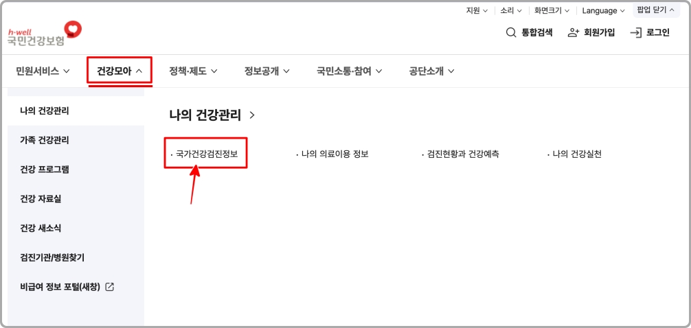 홈페이지에 들어가면 여러 메뉴가 보이는데요. [건강모아] > [나의 건강관리] > [국가건강검진정보] 메뉴를 찾아 클릭해 주세요.