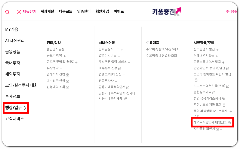 제가 이용하는 키움증권의 경우 홈페이지 접속 후 전체메뉴 보기를 클릭하면 나오는 '뱅킹/업무' 메뉴에서 '서류발급/조회' 에 있는 '해외주식양도세 대행신고' 메뉴를 선택해 신청을 할 수 있는데요, 아직 3월이다보니 오픈이 안된 듯 합니다.