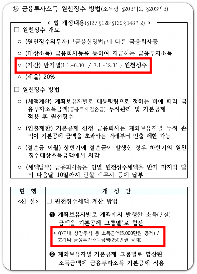 원천징수는 반기별(1/1~6/30, 7/1~12/31)로 이루어지는데요, 반기마다 소득금액에서 기본공제 적용 후 원천징수가 된다고 합니다. 또한 발생한 결손금은 다음 반기의 원천징수 대상 소득금액에서 차감하는 방식으로 계산한다고 하네요. 납세 편의를 위해 개정된 법안이라고 하는데, 뭔가 더 계산만 복잡해졌다는 느낌을 지울 수가 없네요. 세금을 미리 떼가기 때문에 그만큼을 재투자해 얻을 수 있는 기회비용을 잃게 된다는 아쉬움도 있고요.