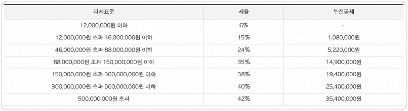 직장인의 경우라면 근로소득과 합산하여 누진세율을 적용받게 됩니다. 종합소득세율을 살펴보면 아래와 같습니다.
