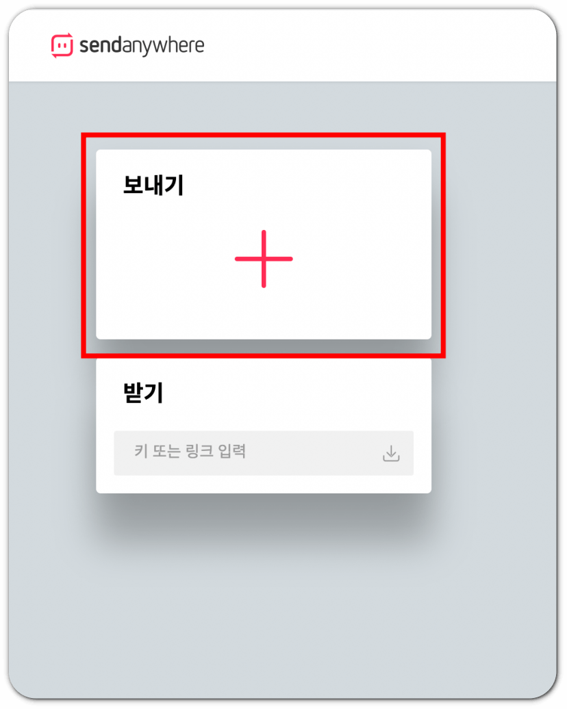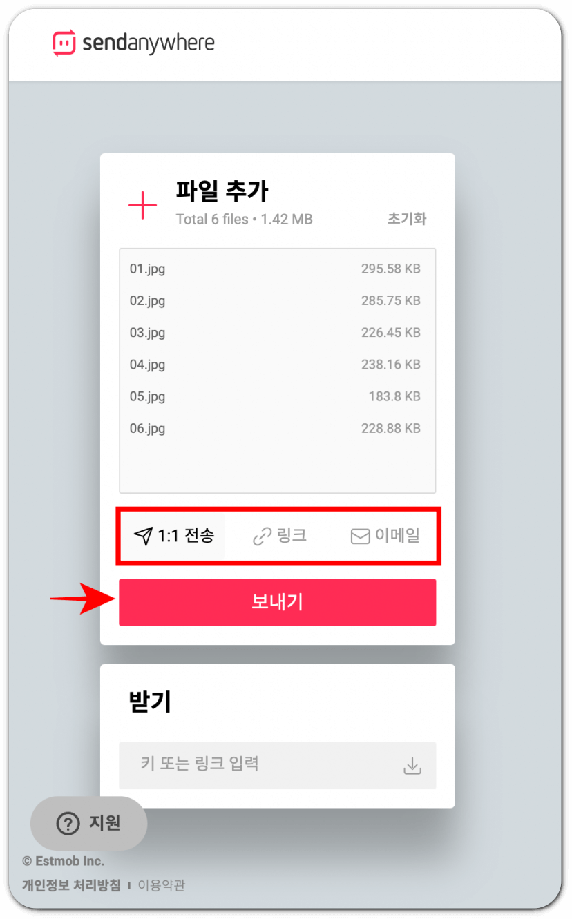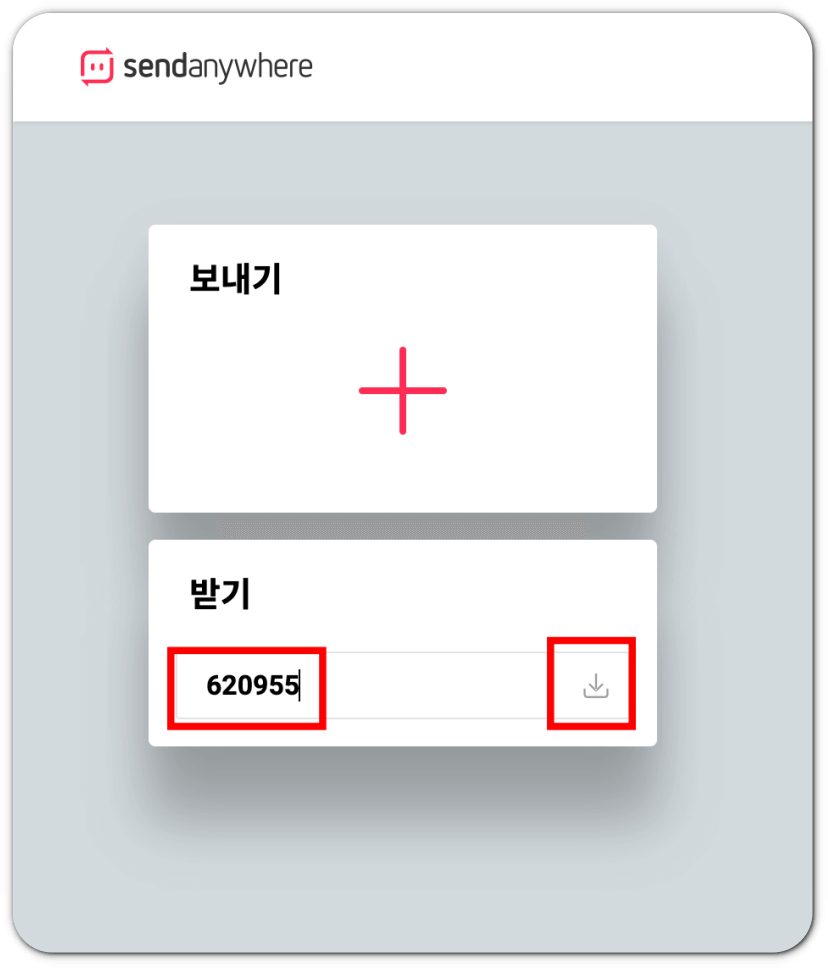 센드 애니웨어 웹사이트에 들어가면 아래와 같은 화면이 뜹니다. '받기'라고 되어 있는 부분에 아까 확인한 6자리 키를 입력해주세요.