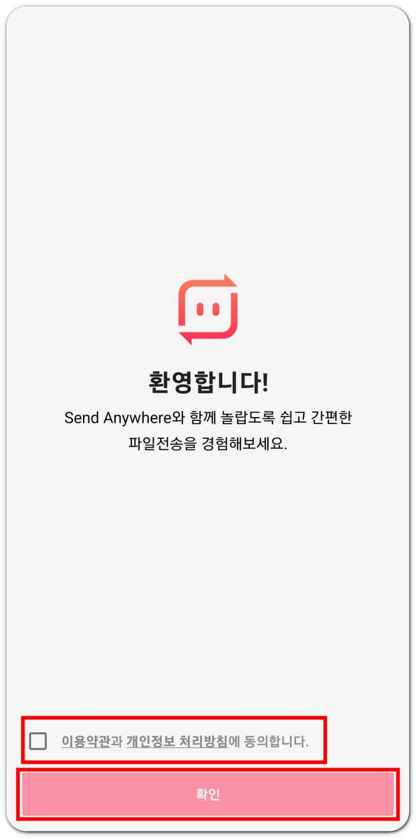 센드 애니웨어 앱을 설치한 뒤 처음 실행하면 아래와 같은 화면이 뜹니다. '이용약관과 개인정보 처리방침에 동의합니다'에 체크를 한 뒤 '확인' 버튼을 눌러 다음 단계로 진행합니다.