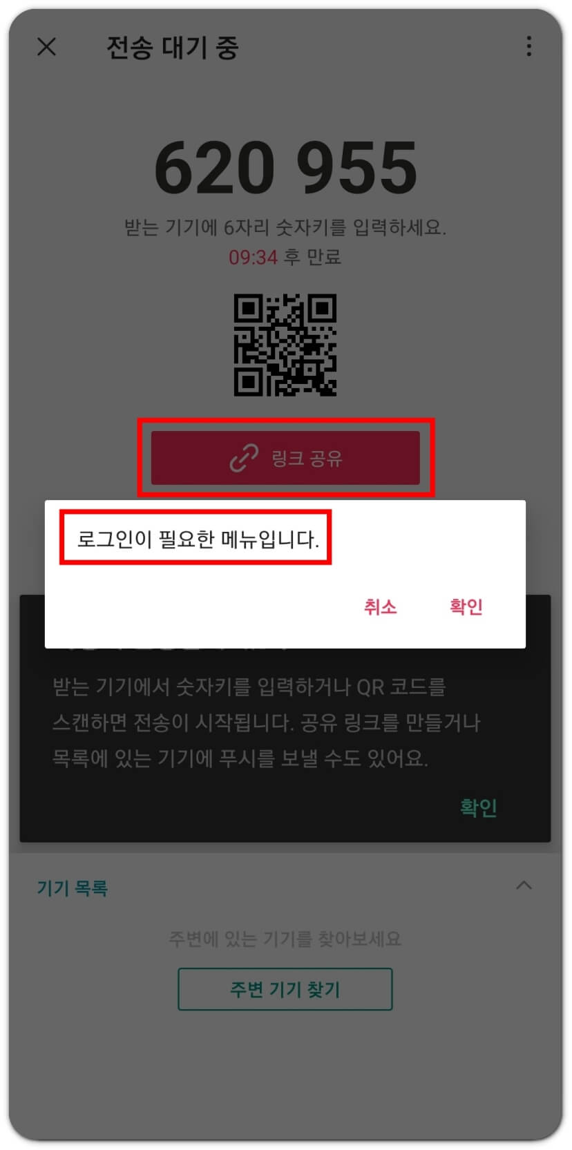 로그인한 뒤, 앞선 파일 전송 화면에서 QR 코드 아래 있는 '링크 공유'를 누르면 아래와 같이 링크가 생성됩니다. 링크를 누르면 자동으로 클립보드에 복사되고요. 대화창이나 이메일에 붙여넣기해 파일을 받을 상대방에게 전송해주면 됩니다.