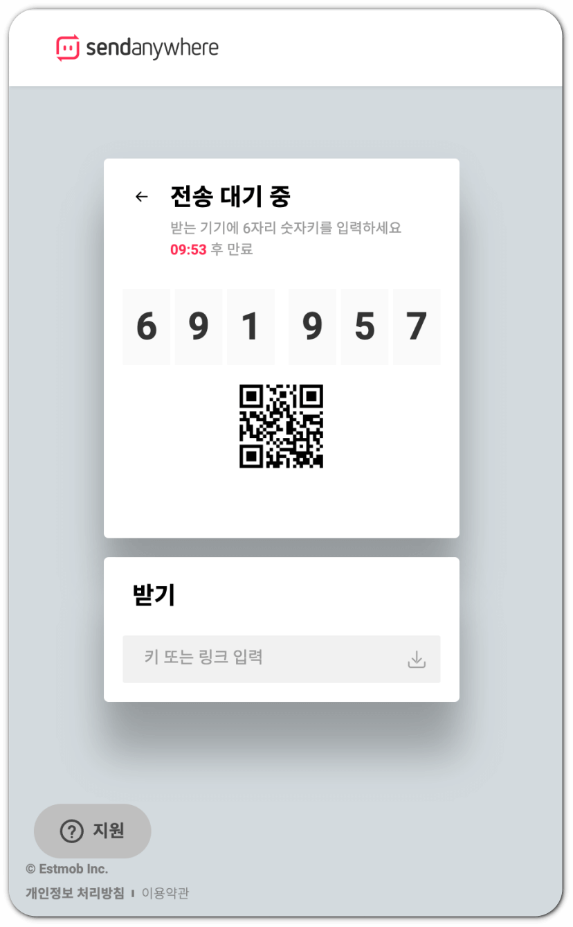 '보내기'를 누른 뒤 잠시 기다리면 아래와 같이 6자리 숫자키를 확인할 수 있습니다. 받는 기기에서 숫자키를 입력하거나 QR코드를 스캔하면 바로 전송이 됩니다. 스마트폰끼리 파일을 주고받는 경우 QR코드를 사용하시면 편리하겠죠. 단, 이 경우 파일을 받을 스마트폰에도 센드 애니웨어 앱이 설치되어 있어야 합니다.