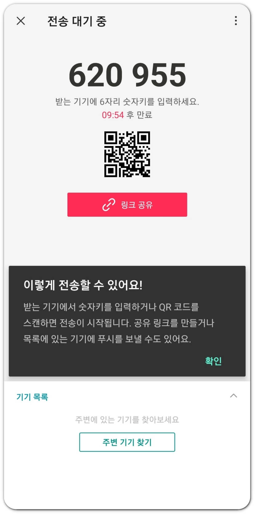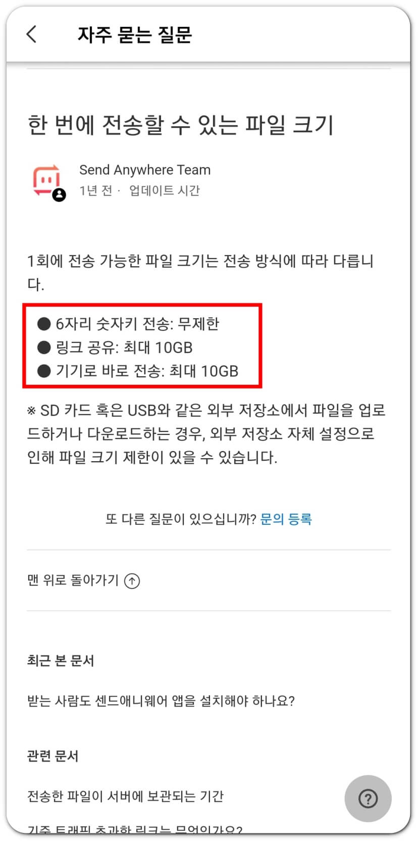 센드 애니웨어를 통해 한 번에 전송할 수 있는 파일의 크기는 전송 방식에 따라 차이가 있다고 합니다. 6자리 숫자키를 전송하는 방법의 경우 무제한으로 이용 가능하다고 해요. 링크 공유 및 기기로 바로 전송 기능을 이용할 경우 최대 10GB로 제한됩니다.