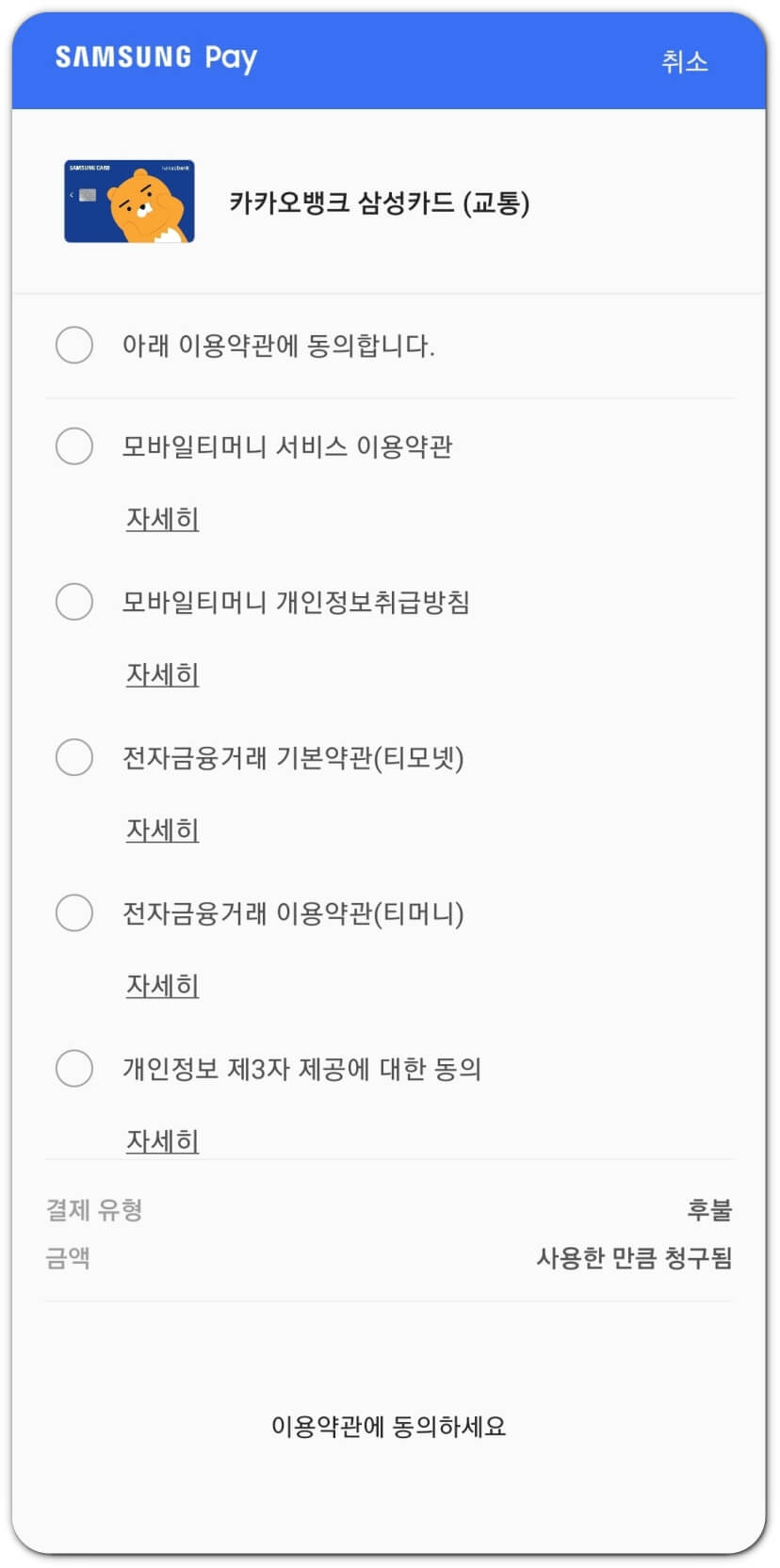 삼성페이 교통카드 사용이 처음이라면 아래와 같은 화면이 뜹니다.