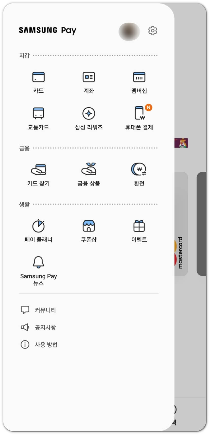 먼저 삼성페이 앱을 열어줍니다. 그리고 왼편 상단에 있는 줄 세개를 눌러 메뉴를 열여주세요.