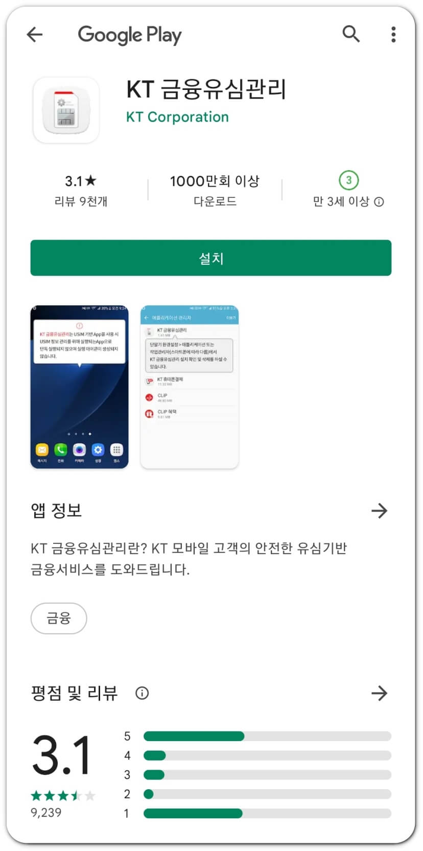 '확인'을 누르면 구글 플레이가 자동으로 열리면서 'KT 금융유심관리' 설치 화면이 뜹니다. '설치' 버튼을 클릭해 주시면 됩니다.