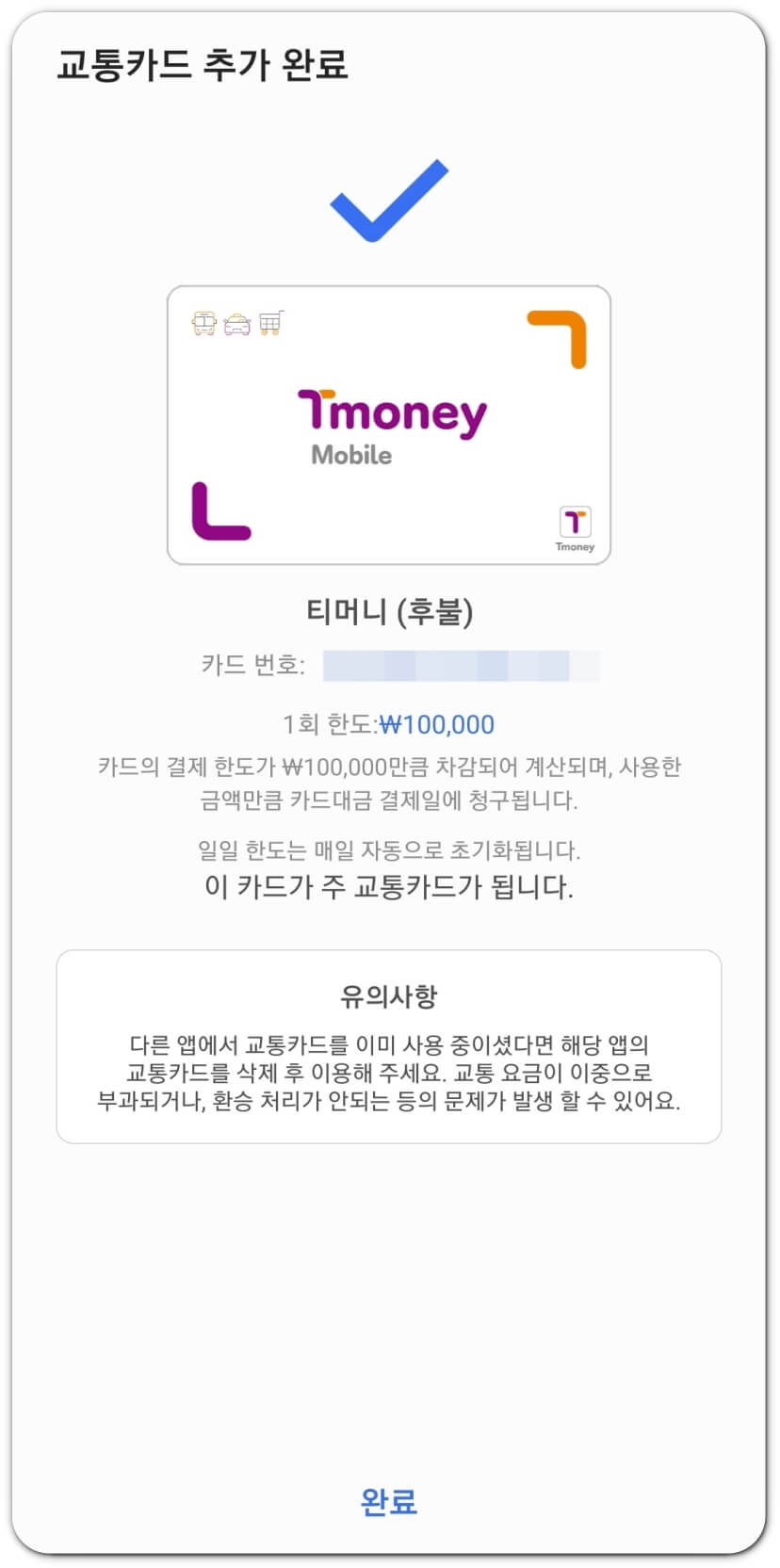 교통카드 추가가 완료되었습니다. 1회 한도가 100,000원이라고 뜨네요.
