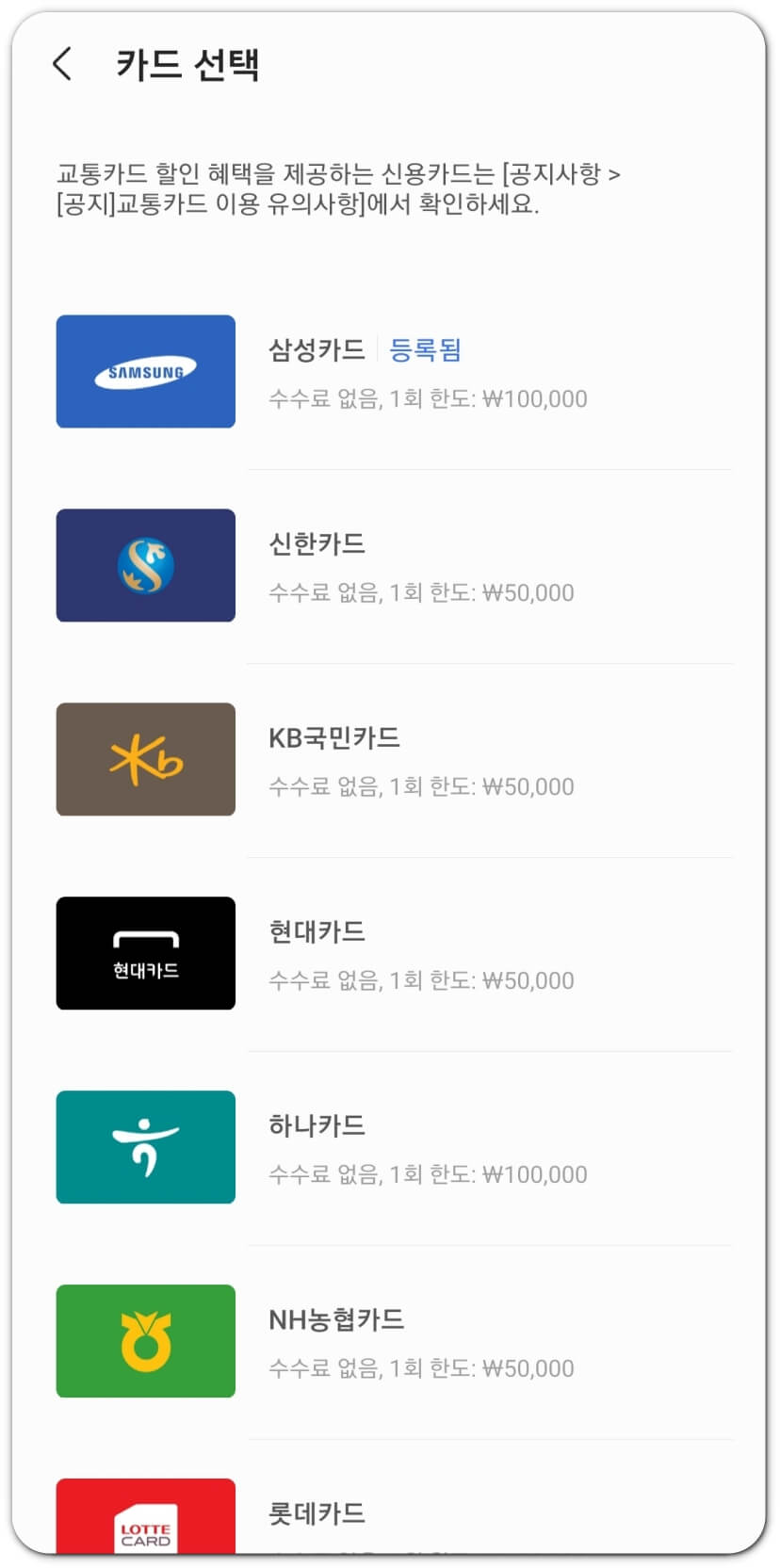 다음으로는 어떤 카드를 교통카드로 사용할 것인지 선택하는 화면이 뜹니다. 삼성페이에 등록되어있는 카드 중 교통카드로 사용할 수 있는 카드들이 뜨는 듯 해요. 원하는 카드를 선택해주면 됩니다.