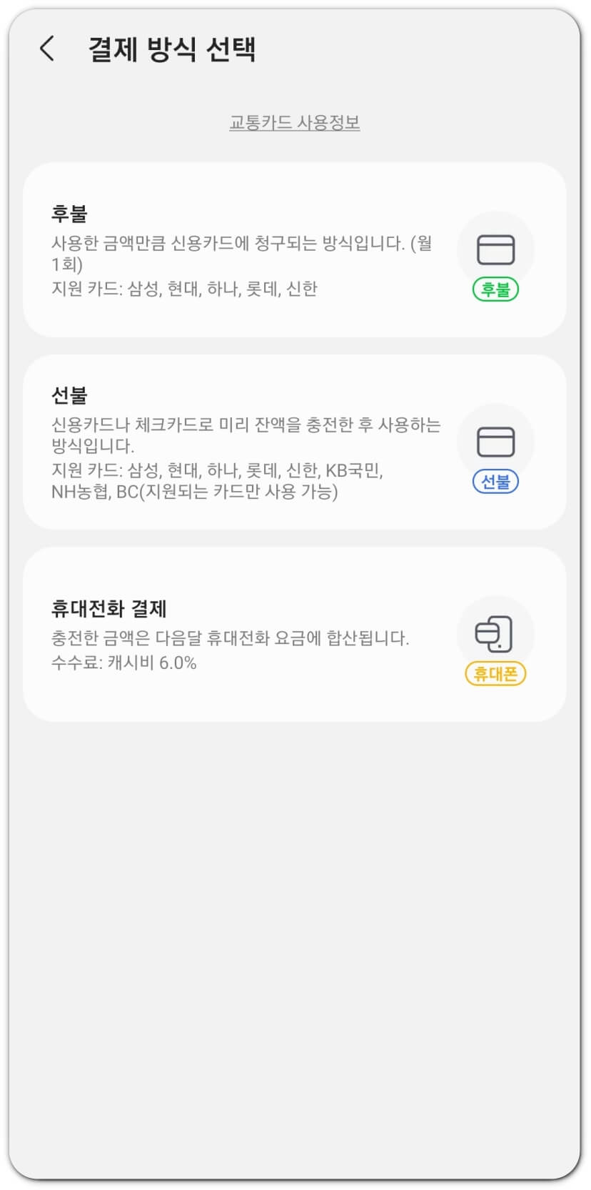 티머니와 캐시비 두 종류 중 선택이 가능합니다. 선불 또는 후불로 선택이 가능하고, 티머니 또는 캐시비 가맹점에서도 사용이 가능하다고 해요.