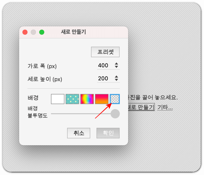 '새로 만들기'를 누르면 아래 화면처럼 새로 만들 이미지의 크기, 배경 등을 설정하는 창이 뜨는데요, 원하는 크기를 입력한 뒤 '배경'을 가장 오른쪽에 있는 투명 배경으로 선택합니다.