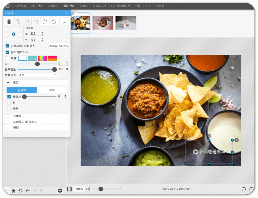 마찬가지로 크기를 조절하고, 적당한 곳에 위치를 잡아주세요. 이렇게 하면 다른 사진들에도 똑같은 크기, 똑같은 위치로 적용이 됩니다.