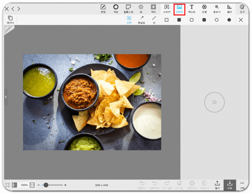 워터마크를 넣고자 하는 이미지를 불러온 뒤, 상단 오른편의 아이콘 메뉴들 중 '삽입' - '이미지'를 클릭해 주세요.