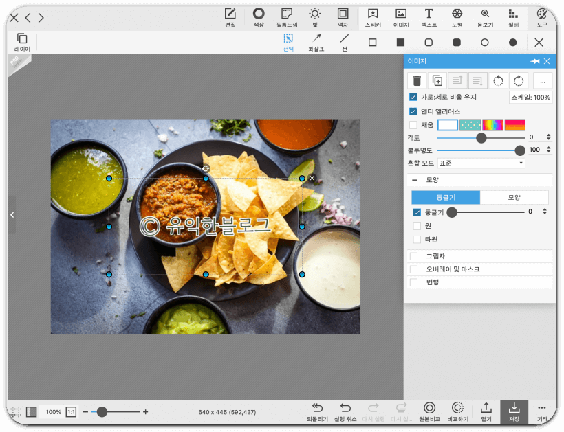 원하는 크기로 조절하고, 위치를 잡아준 뒤 오른편 하단의 '저장' 버튼을 눌러주면 됩니다.