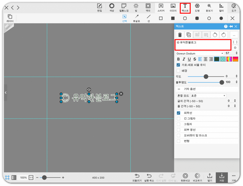 원하는 문구를 입력하고, 글자 크기, 색상, 서체, 외곽선 등을 원하는 스타일로 편집해 줍니다.