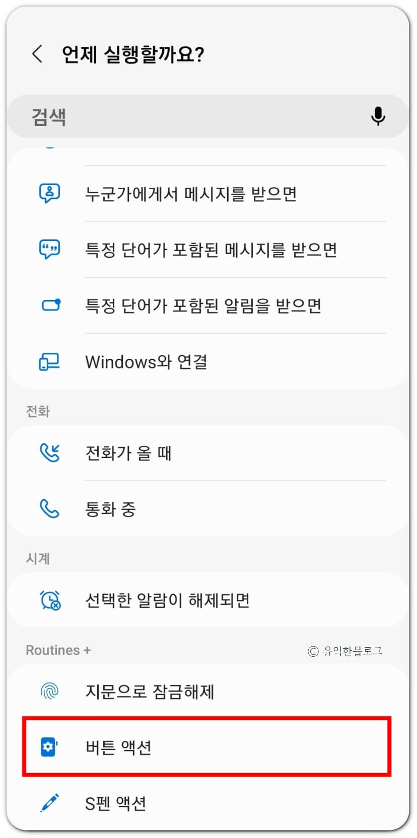 언제 실행할지 선택하는 화면이 뜨면, 'Routines+' 섹선에 있는 '버튼 액션' 메뉴를 선택해 주세요.