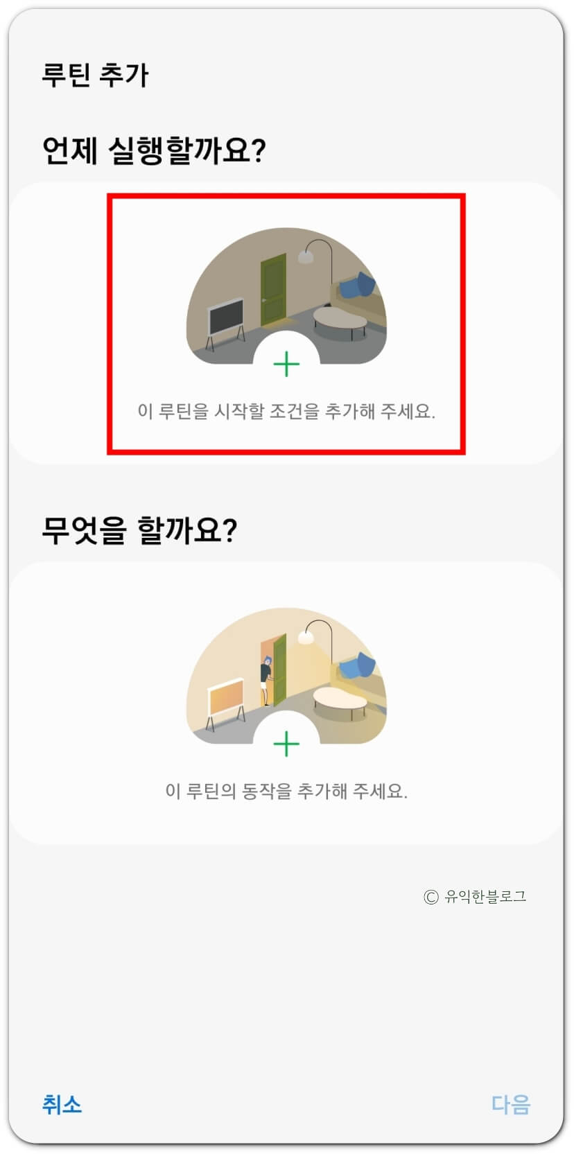 그리고 '이 루틴을 시작할 조건을 추가해 주세요.' 라고 되어 있는 곳을 눌러 조건을 지정해 줍니다.
