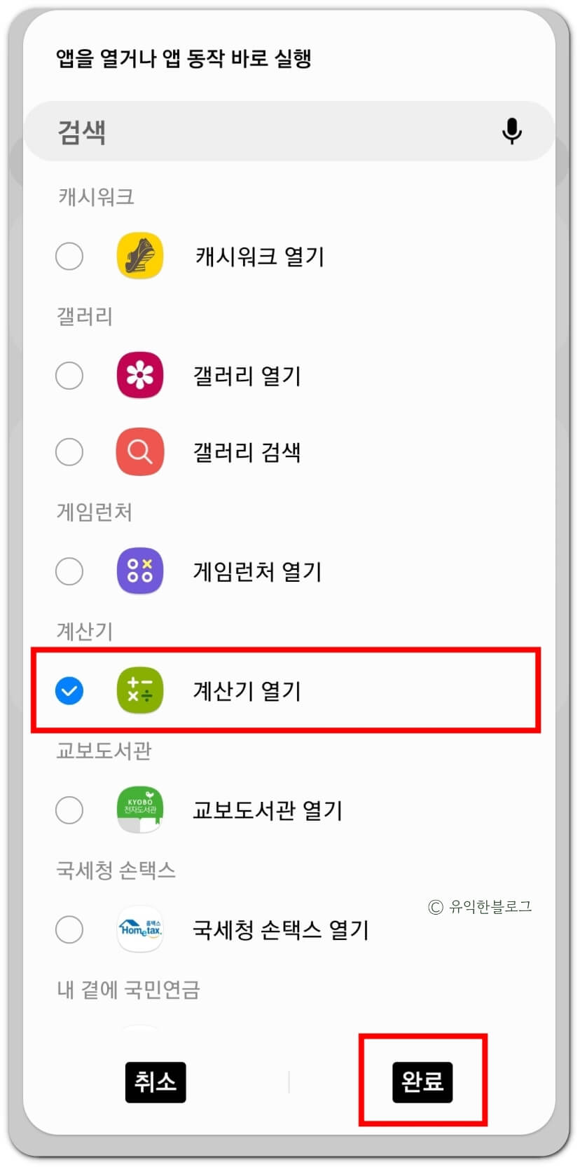 실행하고자 하는 앱을 선택하면 됩니다. 전 '계산기 열기'를 선택해 주었어요. 그리고 '완료' 버튼을 누릅니다.
