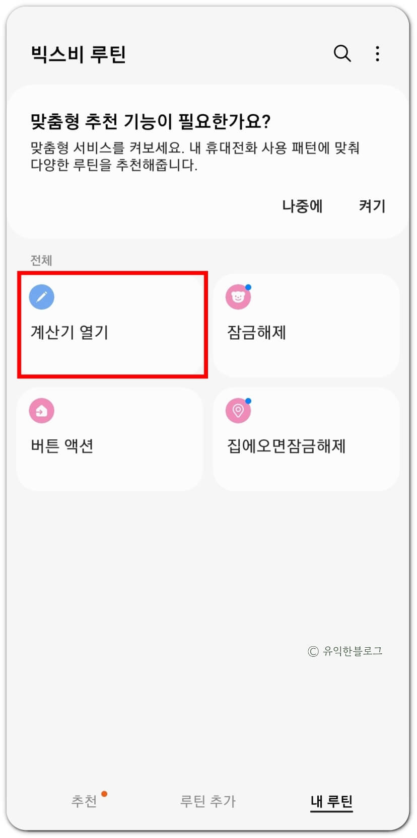 아래 화면처럼 빅스비 루틴의 '내 루틴'에 방금 설정한 빅스비 루틴이 보인다면 설정이 완료된 것입니다.