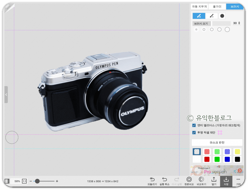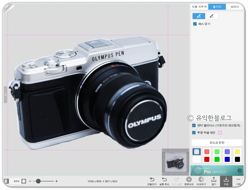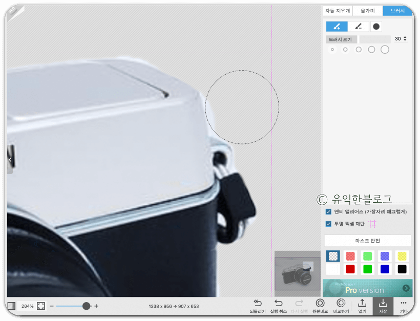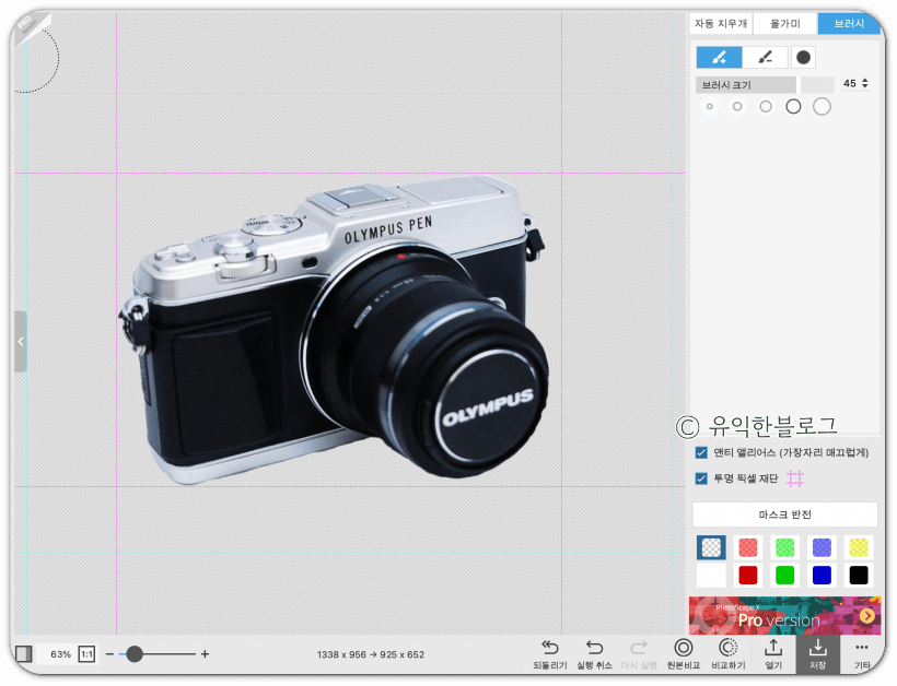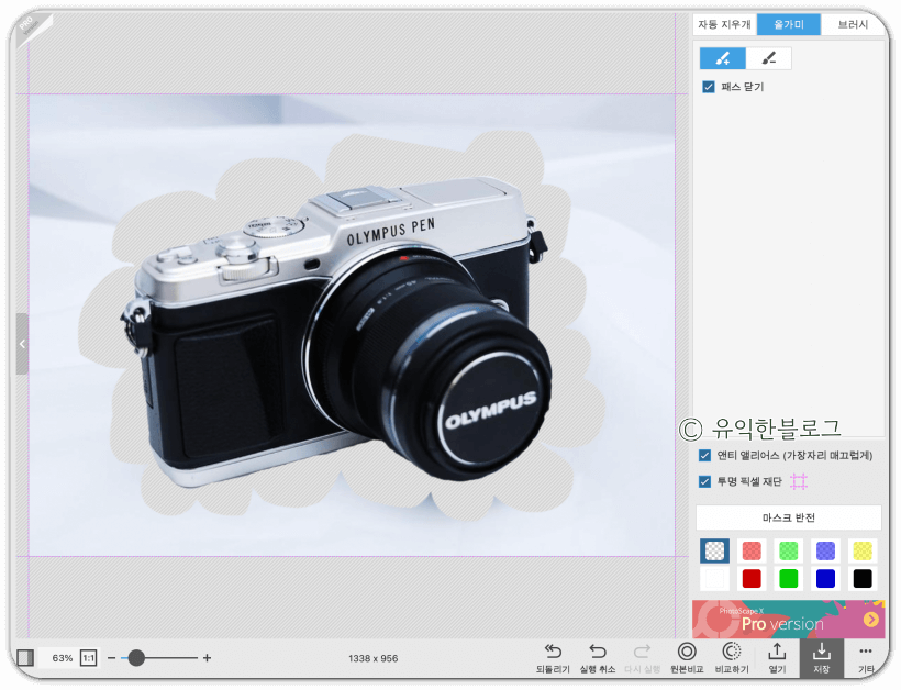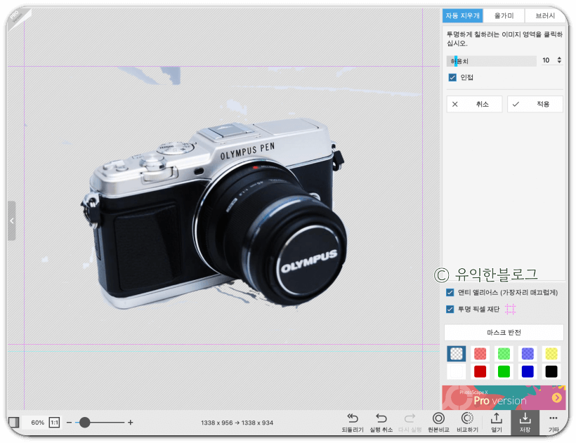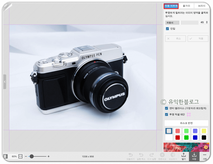 '자동 지우개'를 선택한 뒤, 지우고 싶은 배경 부분을 클릭해주면 됩니다. 허용치를 높게 할 수록 한 번에 지울 수 있는 범위가 넓어지는데, 그 대신 피사체도 함께 지워지는 경우가 많습니다. 허용치를 적절히 조절해가며 배경을 지워줍니다.