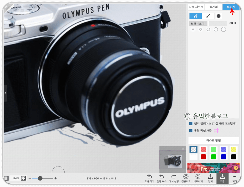 오른편에 있는 '브러시'를 선택한 뒤, 원하는 크기로 브러시를 조절한 뒤 제대로 지워지지 않은 나머지 부분을 정리해줍니다.