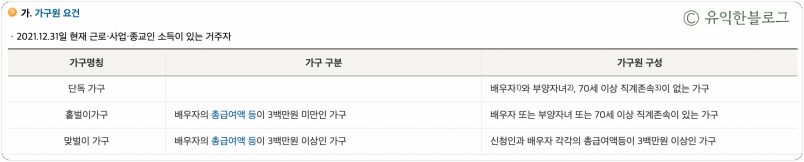 단독 가구, 홑벌이 가구, 맞벌이 가구로 나뉘며 어떤 가구에 해당하느냐에 따라 소득 요건도 달라지게 됩니다. 본인이 어떤 가구에 해당하는지는 아래 표를 참조해주세요.