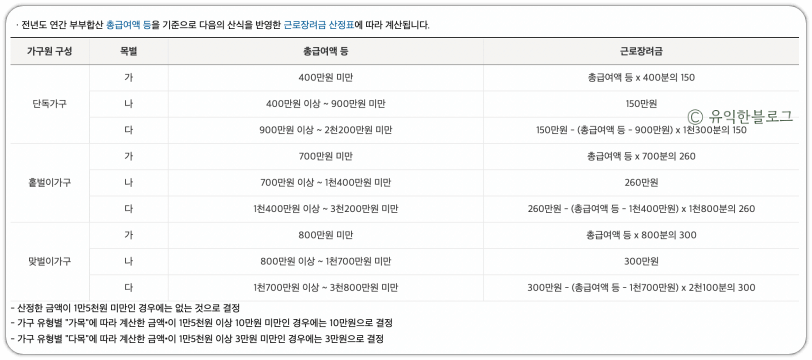 올해부터 근로장려금 자격요건 중 소득요건이 다소 완화되었습니다. 연간 부부합산 총소득금액이 기준금액 미만이면 됩니다.